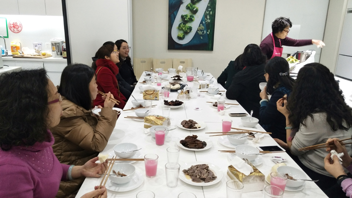 大家先喝了开胃的柠檬汁,再品尝了干切牛肉、鸭胗,红烧猪蹄、鸡翅、排骨,还有南瓜浓汤、藕汁、豆浆,每道菜都让大家点赞。