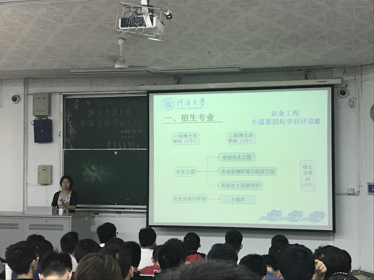 61日,水电院、农工院2015级全体同学于科学会堂101召开职业生涯发展暨就业升学动员大会。水电院方国华副院长、农工院陈菁副院长、水电院戴玉珍副书记为同学们做了就业与升学的讲座。