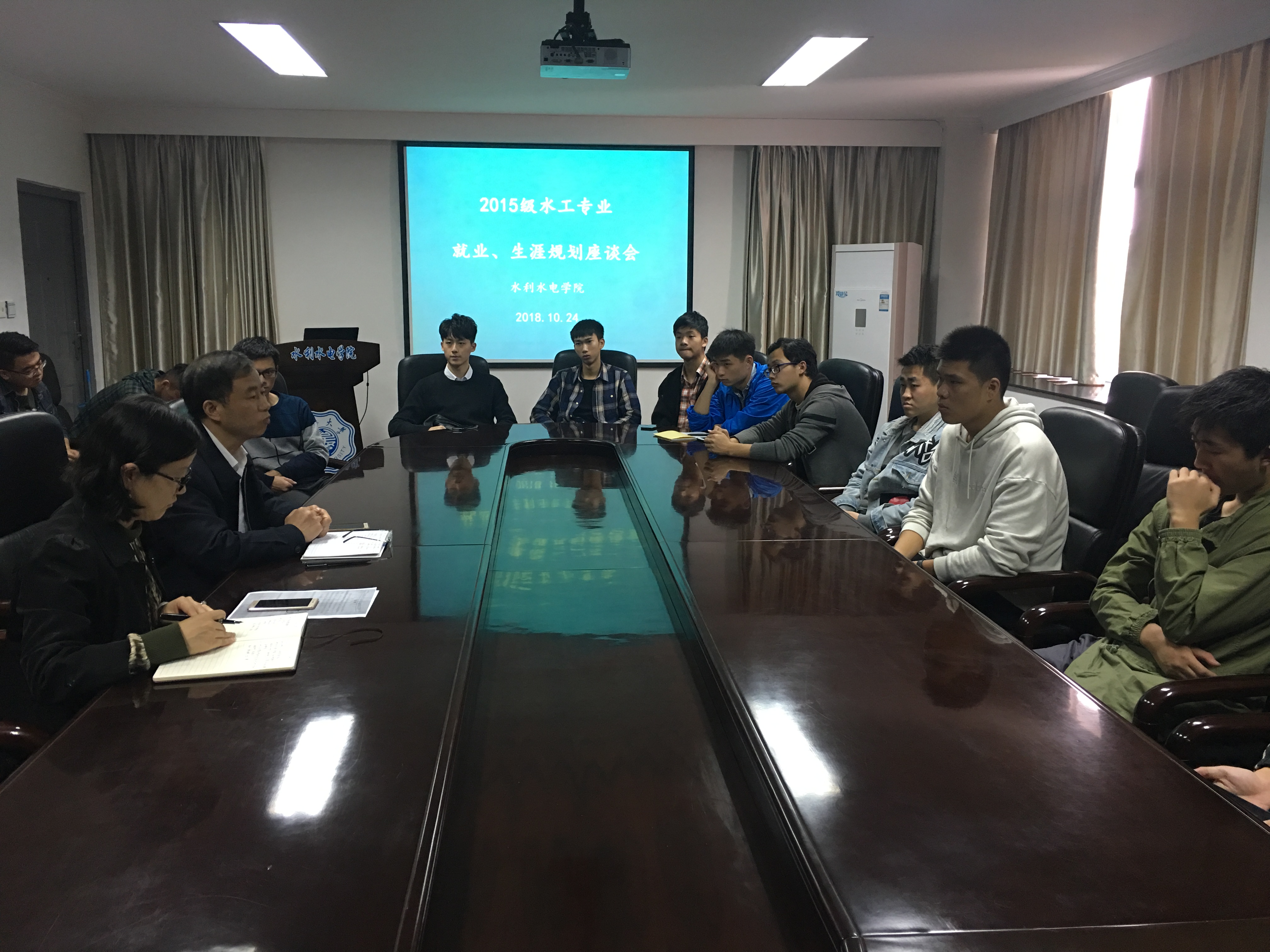 10月24日,葡京娱乐场 举行2015级水工专业就业、生涯规划座谈会。会议邀请院党委戴玉珍副书记、水利水电工程系主任蔡付林教授参加,2015级辅导员笪步源和水工专业学生代表共同参与座谈。