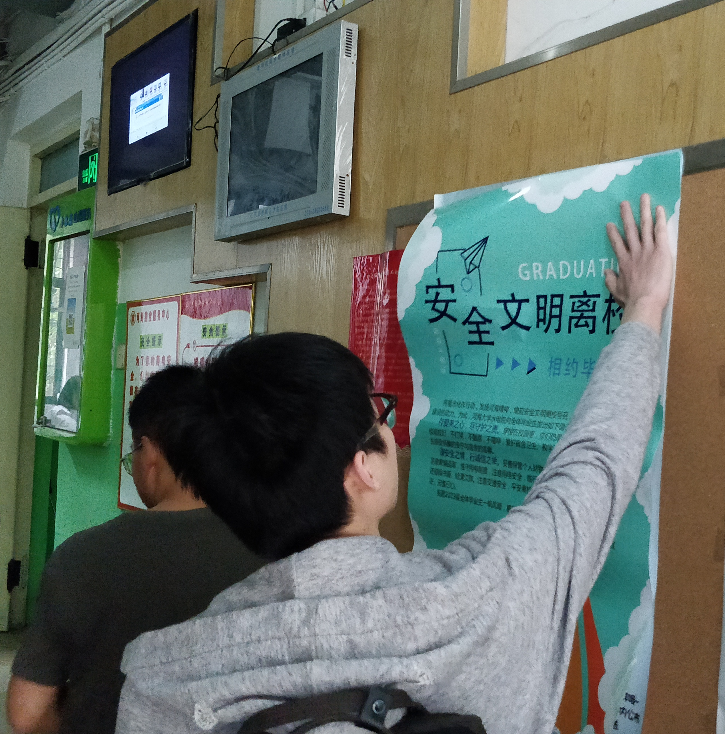 2019年6月,葡京娱乐场 开展了毕业生“安全离校”活动。本次的活动分两个部分展开:第一,在各毕业生宿舍楼道张贴主题宣传海报,向毕业生们传播安全离校理念;第二,在一食堂门口开展“感恩母校无私培育情,倡导安全离校风”的签名活动,组织路过毕业生们在横幅上签名纪念。大家响应积极,并深情感谢母校的三年栽培。