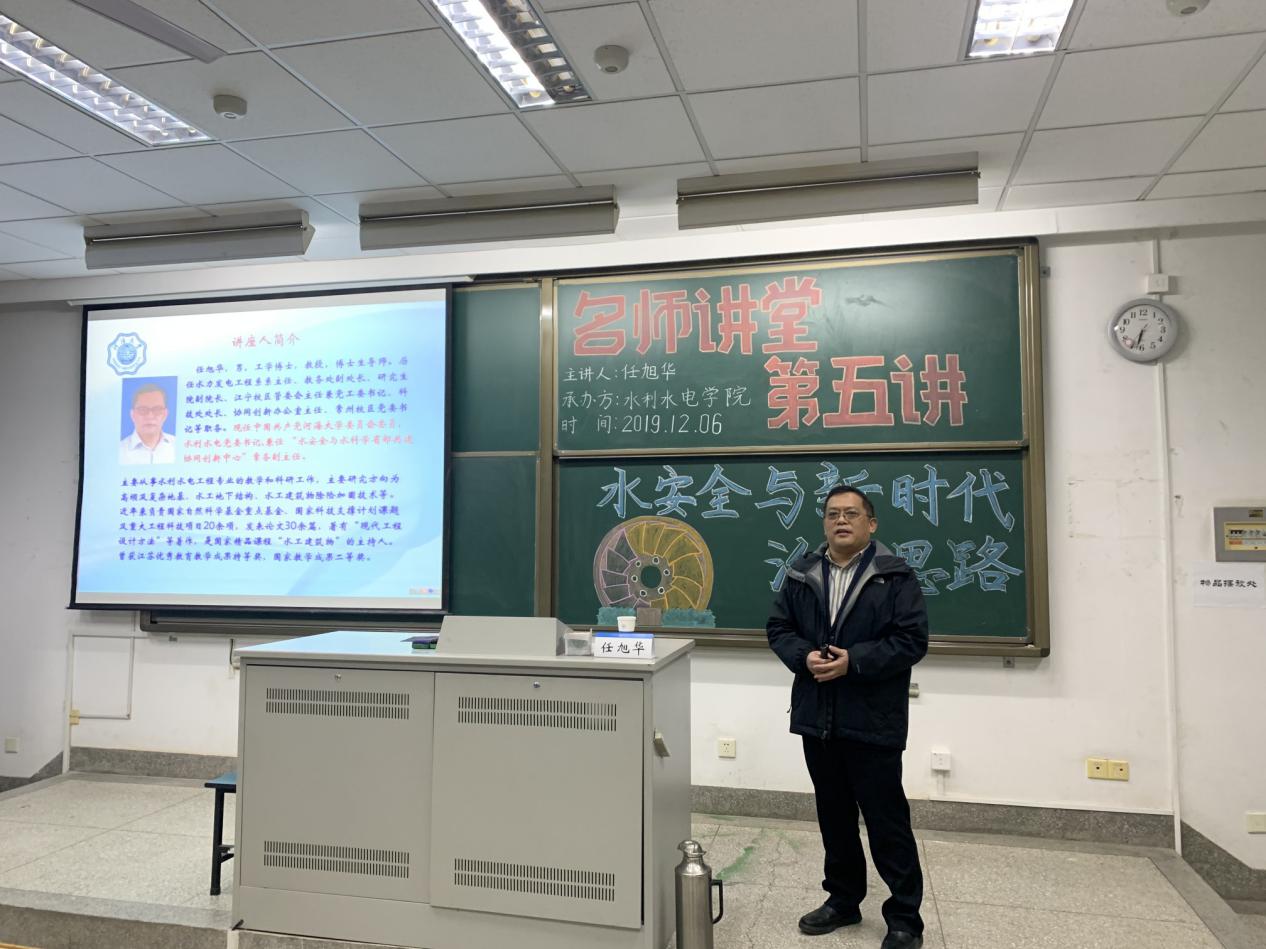 12月6日,为加深葡京娱乐场 学生对一流学科的认知,增强专业自豪感,鼓励学生以更好的姿态加入到一流学科的共同建设当中,葡京娱乐场 举办“名师讲堂”第五讲,院党委书记任旭华教授以《水安全与新时代治水思路》为题,为2019级新生作了一场别开生面的报告会,本次报告会由2019级辅导员帅雨婷主持。