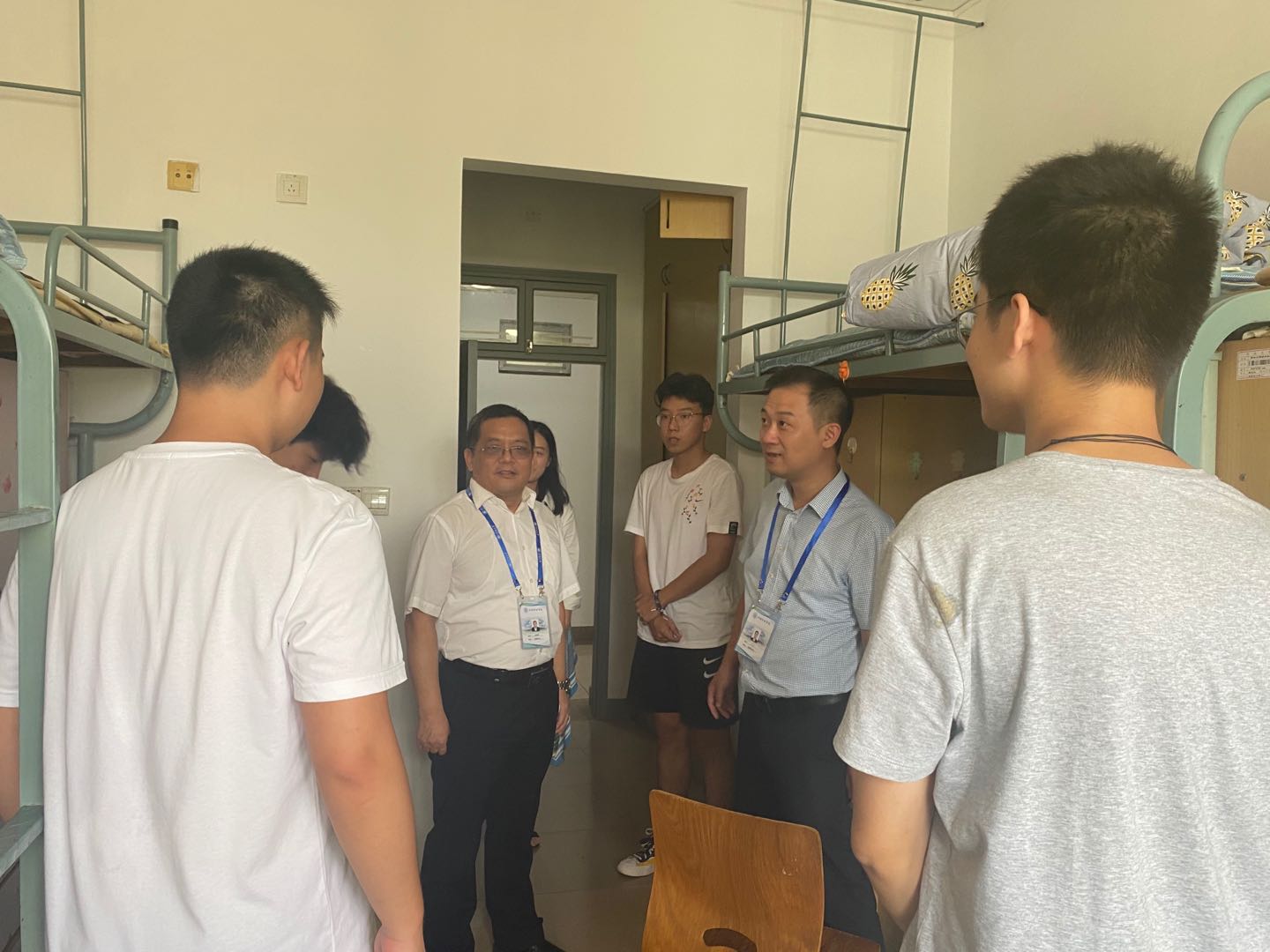 任旭华书记一行来到学生宿舍,查看了新生宿舍基础设施、环境卫生等情况,并深入寝室与同学们亲切交流。任书记代表葡京娱乐场 欢迎新同学的到来,亲切询问同学们第一次离开家乡的感受、对今后大学生活的期待等,希望同学们能尽快适应大学集体生活,遵守学校的相关规定。当看到宿舍同学带有《水工结构工程》书籍时,对同学们提前接触专业知识的做法表示鼓励,期待同宿舍同学一起进步,在大学四年共同努力。
