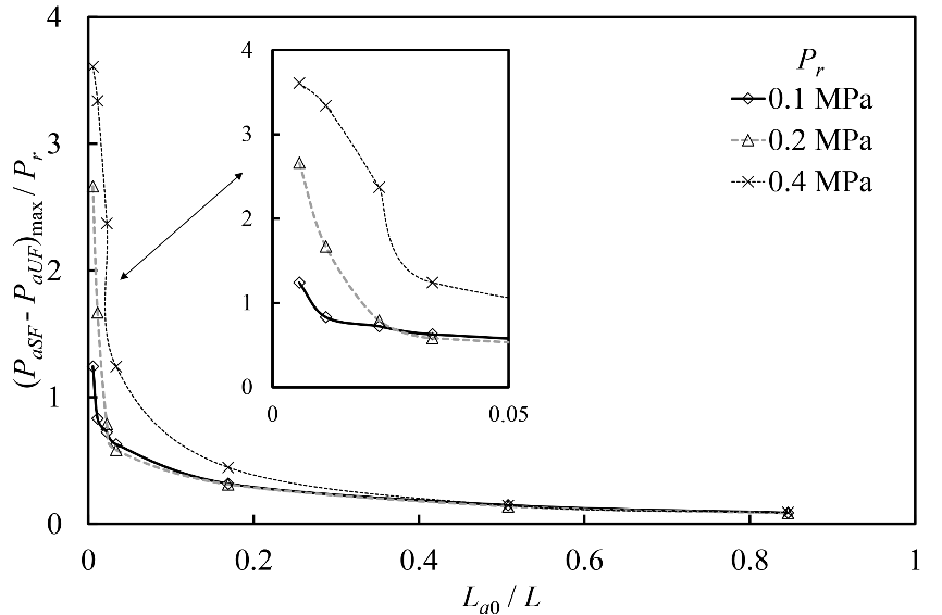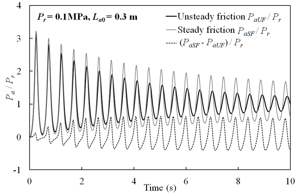 研究团队充分考虑了水流冲击滞留气团过程中水体弹性、动态摩阻及气团热力学特性对压力衰减的影响,建立摩阻-能量耗散数学模型,揭示了动态摩阻对引发水气耦合的能量耗散机理。数值模拟和实验数据对比结果表明,所建数学模型能更准确地模拟实验压力波动曲线(图1)。以往恒定摩阻数学模型低估了压力峰值的衰减,系统压力的最大误差发生在第一个波动周期之后,且在初始气团含量较小和入口压力较高的情况下,数值误差较大;气团最大压力峰值的最大误差发生在初始气团体积的临界值附近,气体含量在2%-3%(图2Trikha-Vardy-Brown动态摩阻基于卷积的动态摩阻模型相比,具有同样计算精度,且计算效率更高;改进的Brunone模型计算效率更高,同时保持了良好的数值精度。