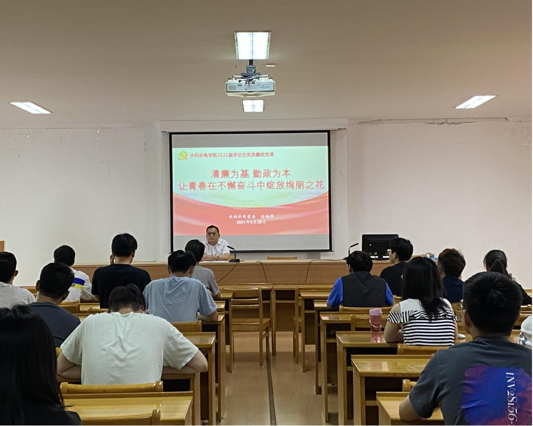 5月28日,葡京娱乐场 党委书记任旭华以《清廉为基、勤政为本,让青春在不懈奋斗中绽放绚丽之花》为题,为全体2021届毕业生党员讲授廉政专题党课。