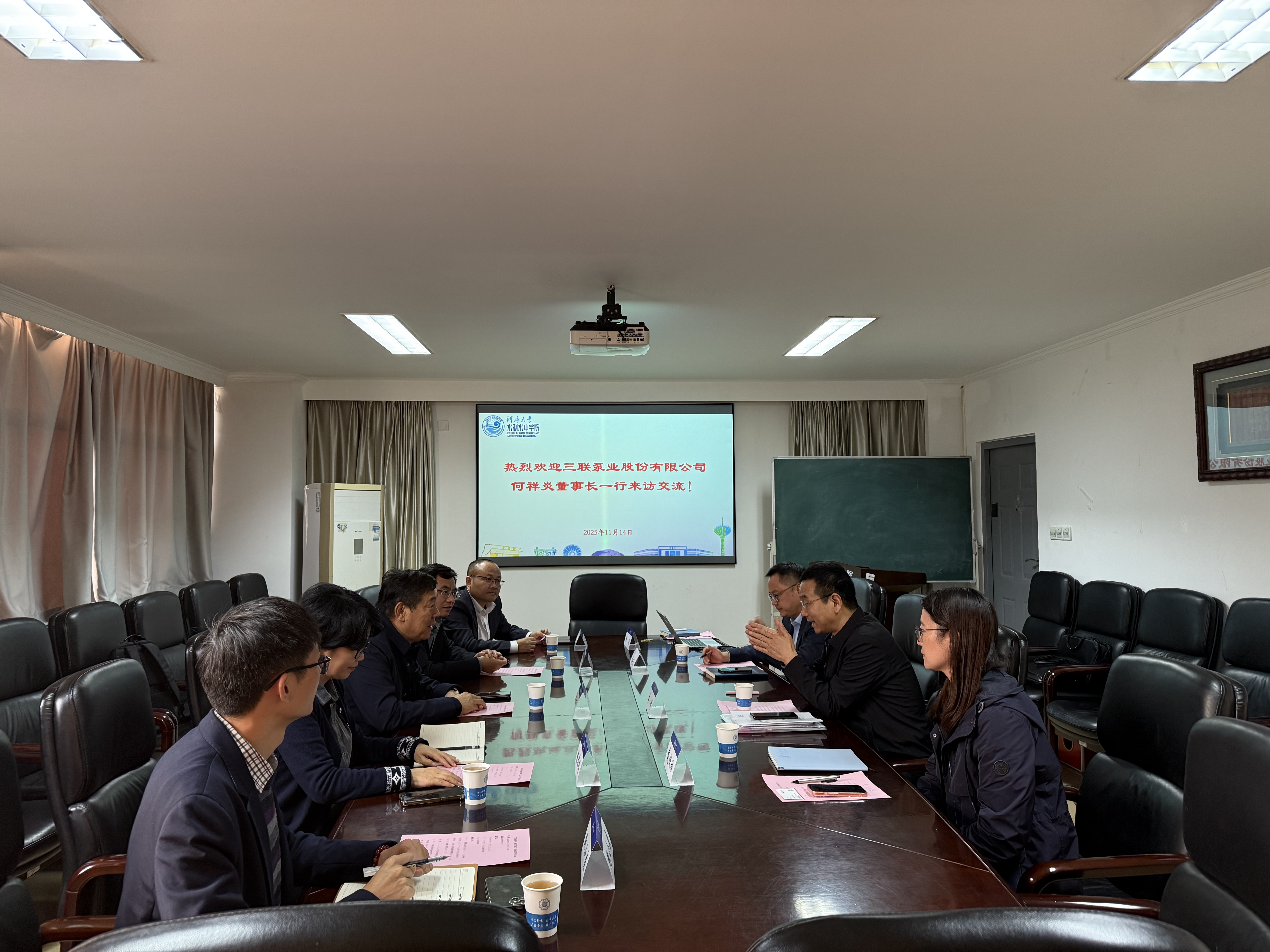 11月14日,三联泵业股份有限公司董事长何祥炎一行来访葡京娱乐场 调研交流,江苏海壹环境科技有限公司总经理陈存根、河海大学苏州研究院副院长许航、三联泵业股份有限公司人事总监陈锁玲、人事经理鲍小康一同到访。葡京娱乐场 党委书记娄健、党委副书记戴媛媛、副院长俞晓东、辅导员陈辰出席座谈会,双方围绕学科建设、人才培养、产学研协同创新等核心议题展开深度交流。