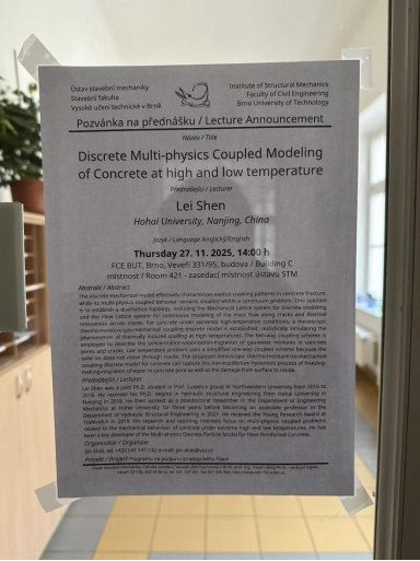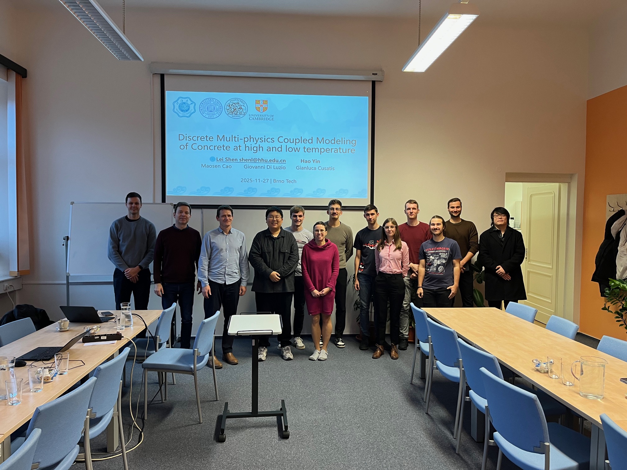 访问期间,沈雷副教授于2025年11月27日(布拉格时间)在布尔诺理工大学土木工程葡京娱乐场 作了题为《Discrete Multi-physics Coupled Modeling of Concrete at high and low temperature》的学术报告。报告系统介绍了基于混凝土离散力学本构的多场耦合分析方法,及其在极端高温与低温环境下的工程应用进展。45分钟的汇报吸引了众多师生参与,现场交流热烈,反响积极。