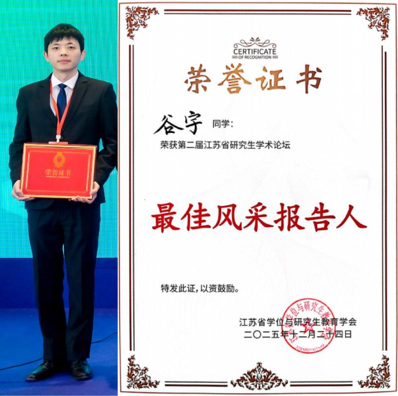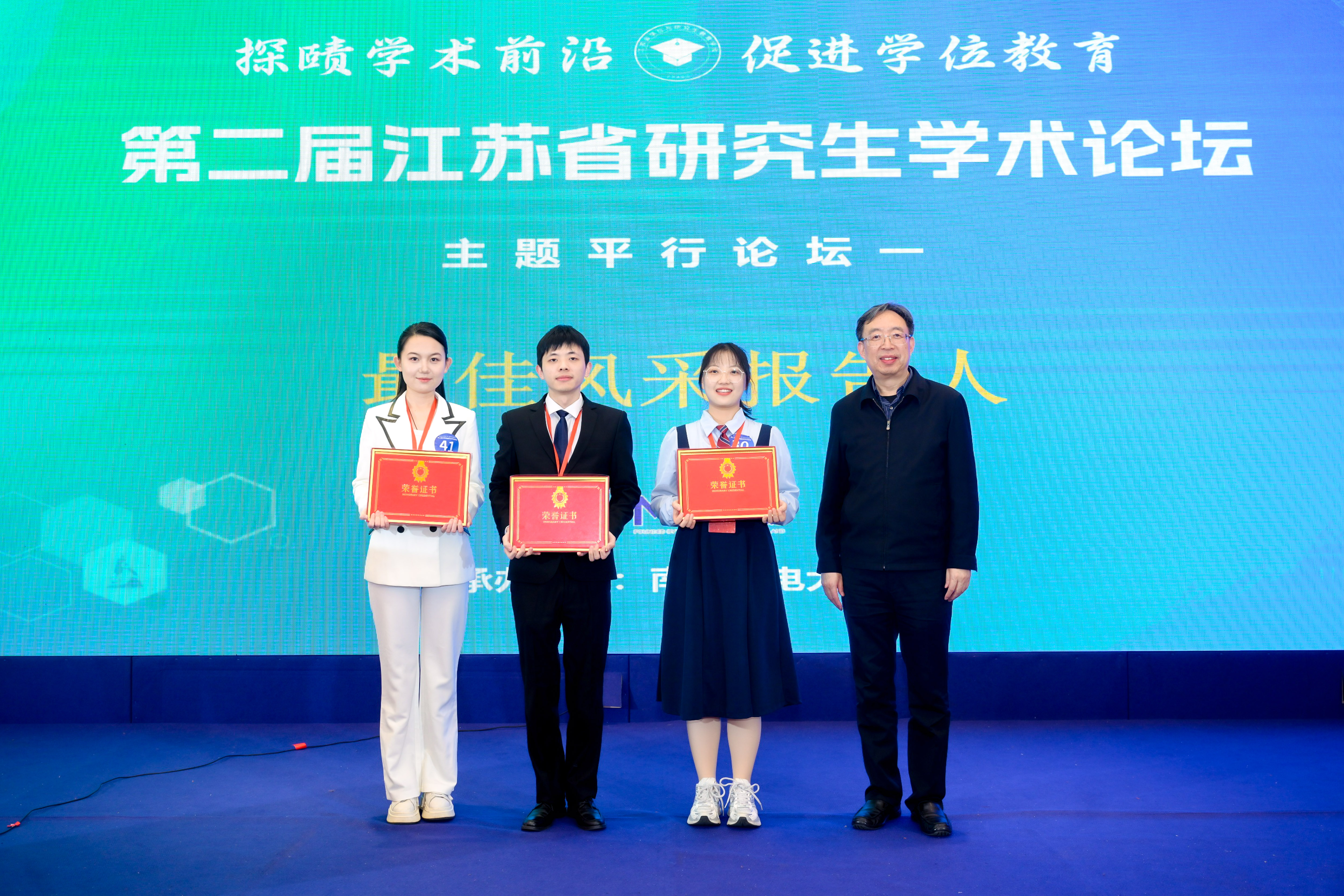 12月24日,第二届江苏省研究生学术论坛在南京成功举办。本届论坛在江苏省教育厅的指导下,由江苏省学位与研究生教育学会主办、南京邮电大学承办,引进了国际学术界通用的“三分钟论文演讲”(3MT)展示模式,强调在极短时间内清晰、生动地阐述科研工作的价值与发现,突出跨学科融合、科研普及与表达能力并重的指导思想。本届论坛由江苏省教育厅原厅长葛道凯、南京邮电大学副校长谢平等多位资深专家担任评委,葡京娱乐场 谷宇同学代表学校参加论坛并获评“最佳风采报告人”和“优秀学术报告”奖,江苏省教育厅原厅长葛道凯为谷宇同学颁发奖项。